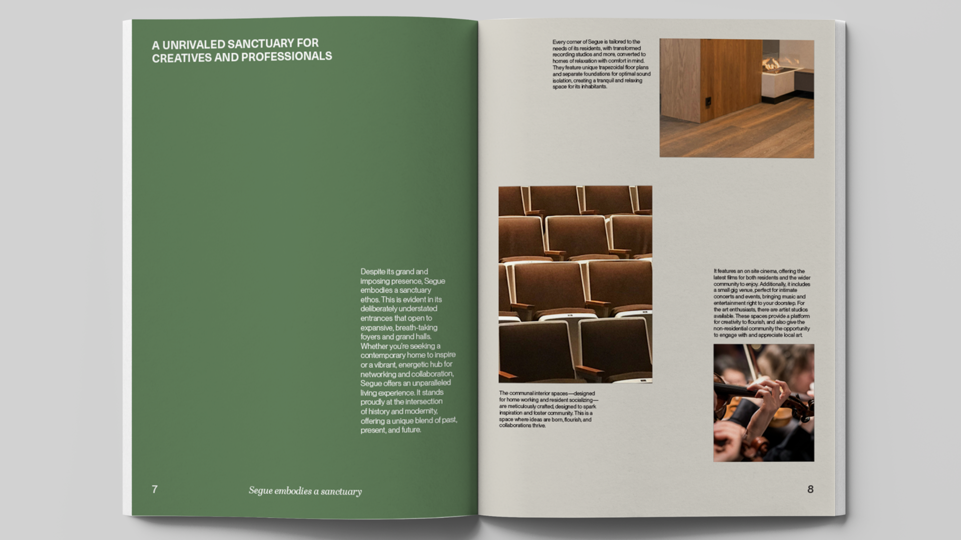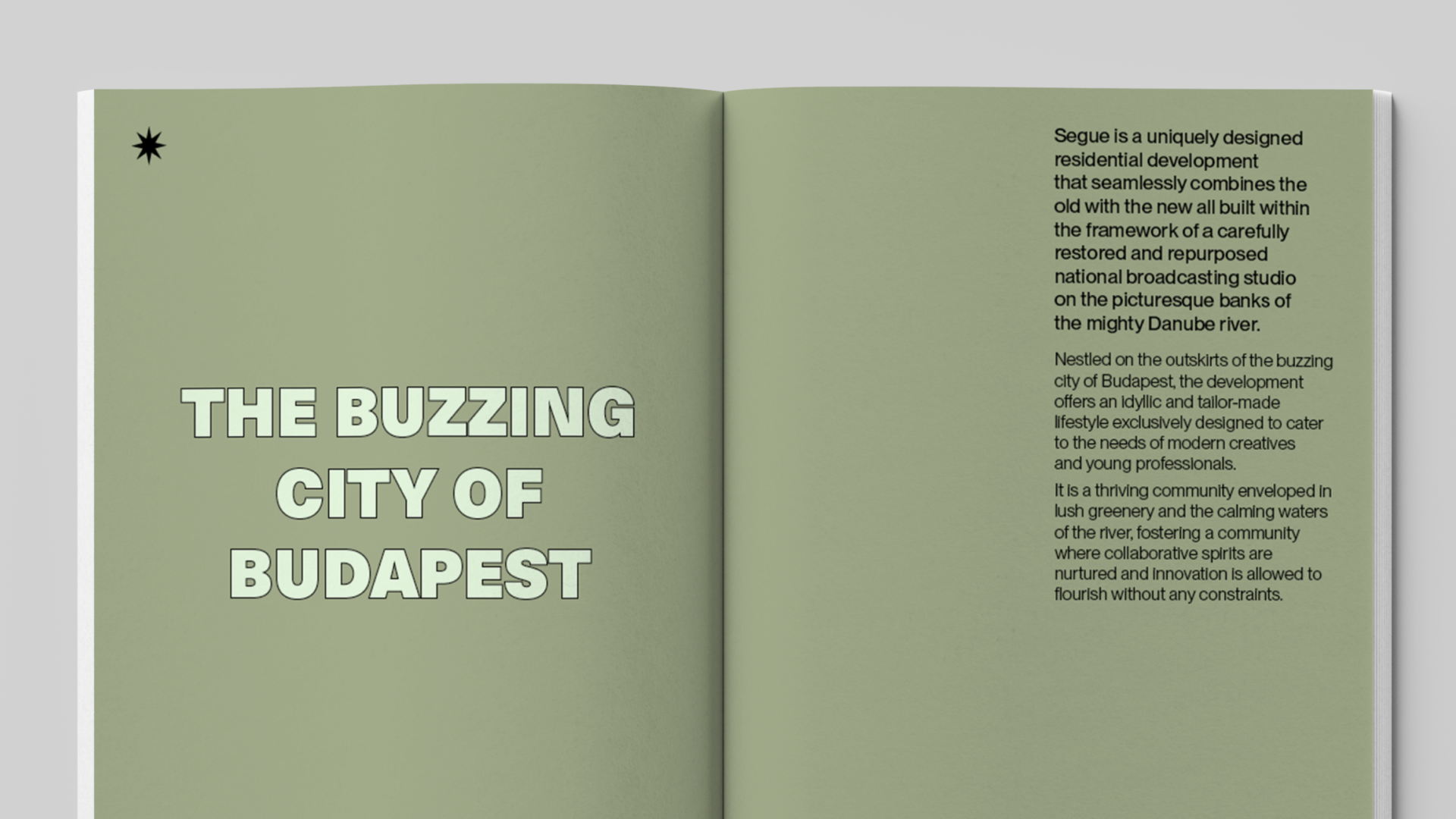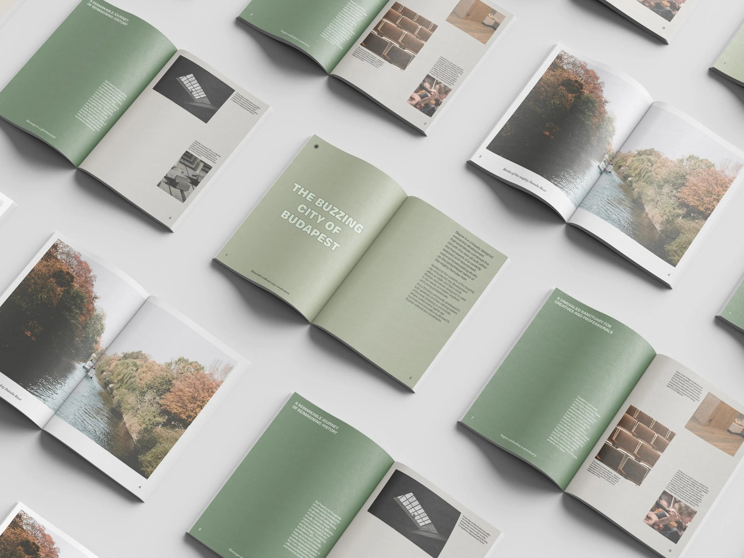 A soft color palette was paired with an asymmetrical layout to create a sense of calm and openness that encourages the practice of creative flow rather than forceful creation. A modern sans was used to establish a simple and clean look throughout the book, while small details were set in an elegant serif to reflect the ethereal atmosphere of the space where creativity is allowed to roam free.